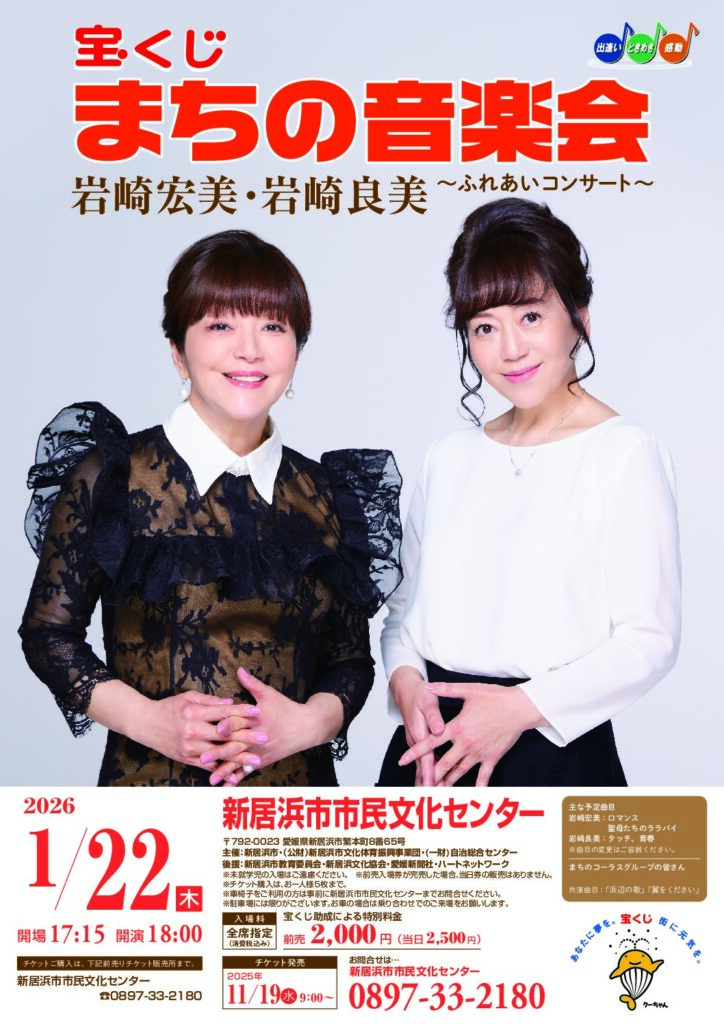 宝くじまちの音楽会2026/1/22(木)宝くじまちの音楽会 岩崎宏美・岩崎良美~ふれあいコンサート~(愛媛県新居浜市) 新居浜市市民文化センター