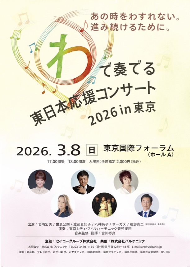 liveライブ情報 その他のコンサート その他のコンサート 2025.11.18 公演日:3/8 (日) 【LIVE】『”わ” で奏でる東日本応援コンサート2026 in 東京』岩崎宏美 参加決定! SEIKO主催「”わ”で奏でる東日本応援コンサート」に出演いたします。 音楽で東日本を応援する特別公演です。 皆さまのご来場を心よりお待ちしております。 会場:東京国際フォーラム(ホールA) 公演日時:2026/3/8 (日) 開演 18:00 (開場 17:00) チケット発売日:2025/12/1 AM 10:00~ 席種・料金:全席指定:¥2,000 詳しいリンクはこちら↓ https://www.seiko.co.jp/music/wa/ 一覧に戻る